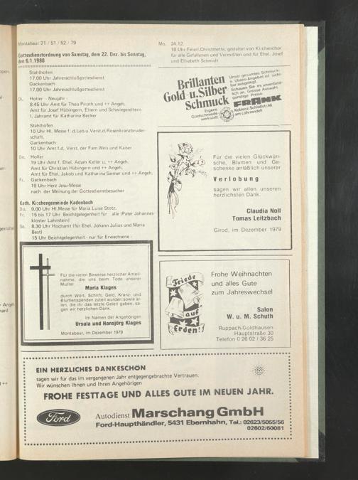 18 Uhr Feierl.Christmette, gestaltet von Kirchenchor für alle Gefallenen und Vermißten und für Ehel. Josef und Elisabeth Schmidt