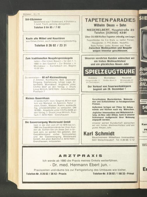 liest in der Zeit vom 27.12.1979 bis 4.1. 1980 die Gaszählerstände bei ihren Kunden ab. Sollten Sie um diese Zeit in Ur - laub sein, so werden Sie gebeten, den Gaszählerstand vorher festzustellen und der Gasversorgung Westerwald GmbH, Am alten Bahnhof 2, 5410 Höhr- Grenzhausen, mitzuteilen.