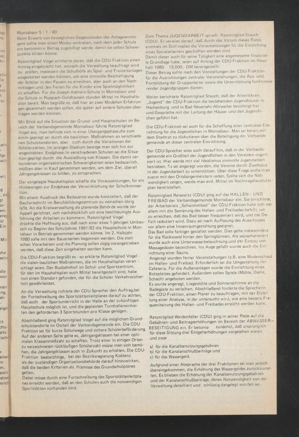 Der CDU-Sprecher wies auch darauf hin, daß in der Verbandsgemeinde ein Großteil der Jugendlichen in den Vereinen organisiert ist. Hier werde mit viel Idealismus sinnvolle Jugendarbeit betrieben. Es sei angeregt worden, die Vereine durch Zuschüsse in der Jugendarbeit zu unterstützen. Über diese Frage wolle man zuerst mit den Ortsbürgermeistern reden. Sollte sich die Notwendigkeit zeigen, werde man evtl. Mittel im Nachtragshaushaltsplan bereitstellen.