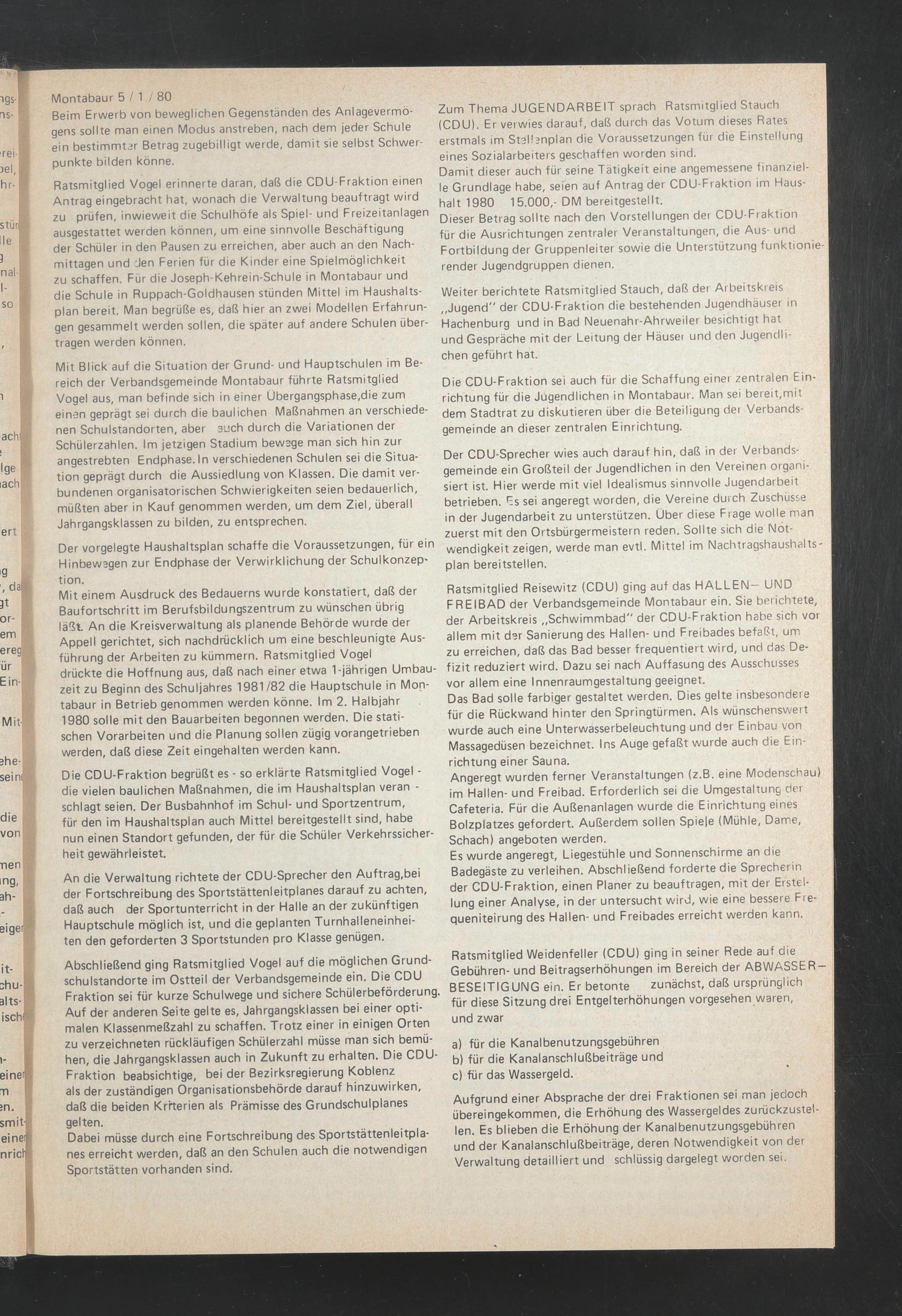 Mit einem Ausdruck des Bedauerns wurde konstatiert, daß der Baufortschritt im Berufsbildungszentrum zu wünschen übrig läßt. An die Kreisverwaltung als planende Behörde wurde der Appell gerichtet, sich nachdrücklich um eine beschleunigte Ausführung der Arbeiten zu kümmern. Ratsmitglied Vogel drückte die Hoffnung aus, daß nach einer etwa 1-jährigen Umbauzeit zu Beginn des Schuljahres 1981/82 die Hauptschule in Montabaur in Betrieb genommen werden könne. Im 2. Halbjahr 1980 solle mit den Bauarbeiten begonnen werden. Die statischen Vorarbeiten und die Planung sollen zügig vorangetrieben werden, daß diese Zeit eingehalten werden kann.