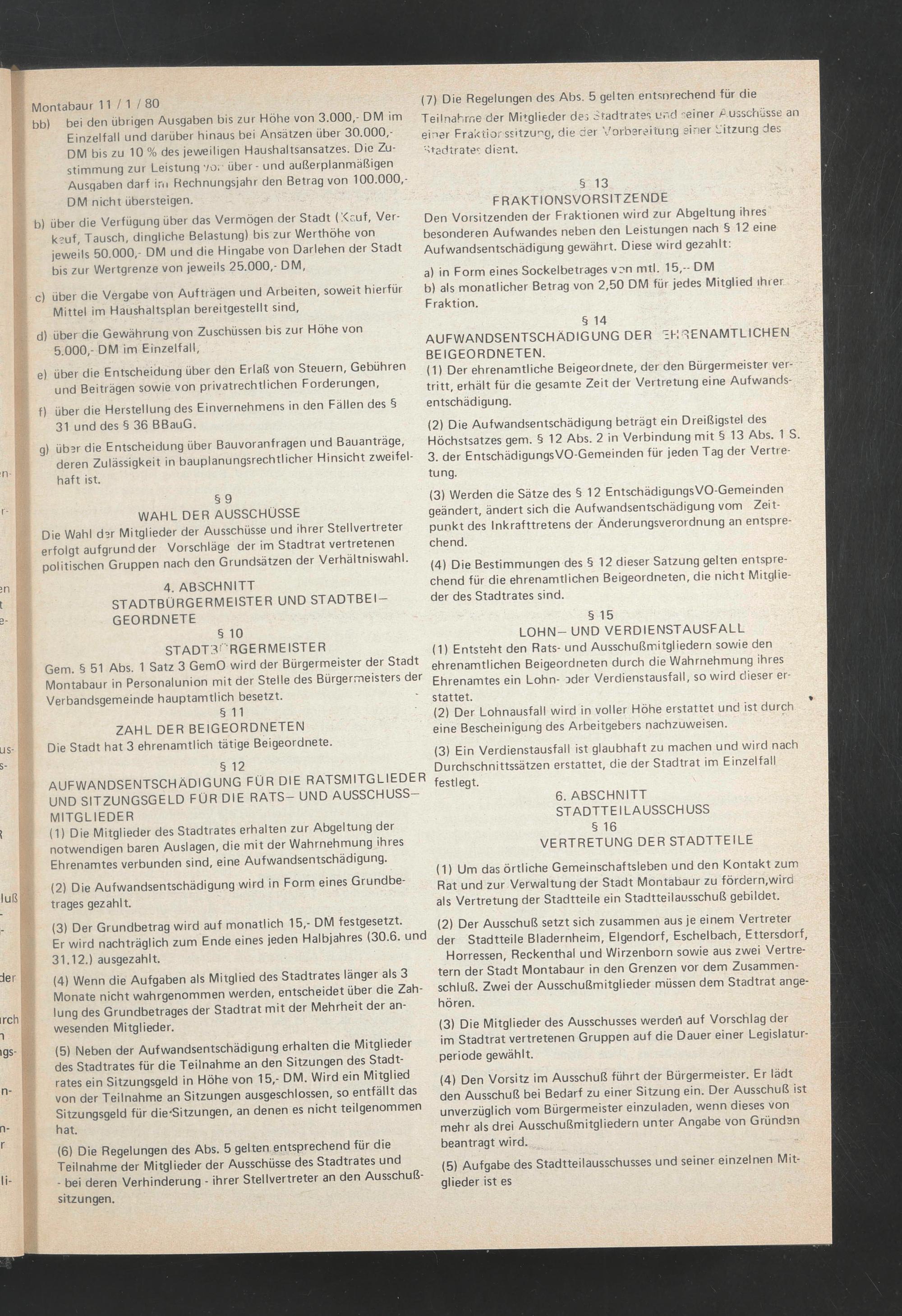 (1) Um das örtliche Gemeinschaftsleben und den Kontakt zum Rat und zur Verwaltung der Stadt Montabaur zu fördern,wird als Vertretung der Stadtteile ein Stadtteilausschuß gebildet.