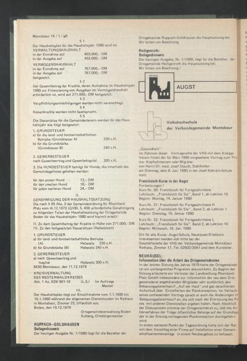 Der Haushaltsplan liegt zur Einsichtnahme vom 7.1.1980 bis 16.1.1980 während der allgemeinen Dienststunden im Rathaus in Montabaur, Zimmer 23, öffantlich aus.