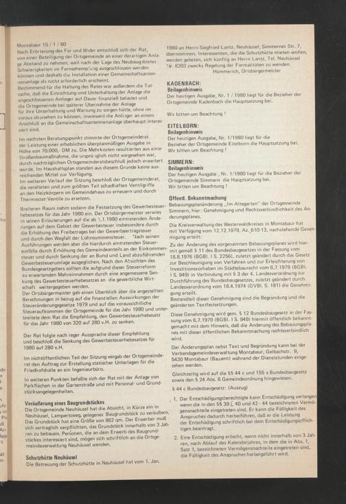 Der heutigen Ausgabe, Nr. 1 / 1980 liegt für die Bezieher der Ortsgemeinde Kadenbach die Hauptsatzung bei.