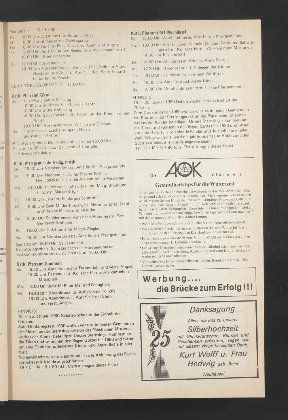 Zum Dreikönigsfest 1980 wollen wir uns in beiden Gemeinden der Pfarrei an der Sternsingeraktion des Päpstlichen Missionswerkes der Kinder beteiligen. Unsere Sternsinger kommen an die Türen und wünschen den Segen Gottes für 1980 und bitten um eine Gabe für notleidende Kinder und Jugendliche in aller Welt.