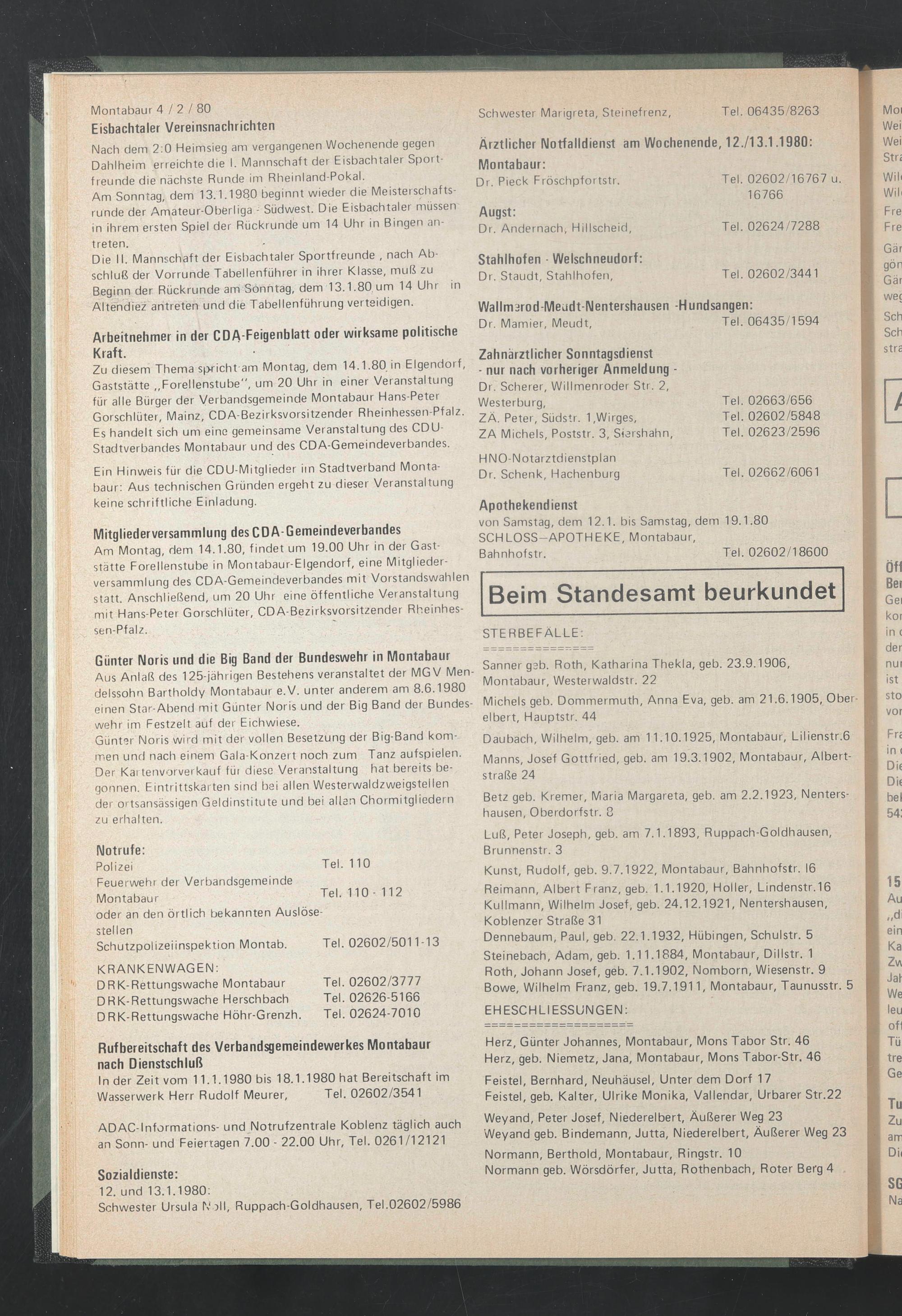 Ärztlicher Notfalldienst am Wochenende, 12./13.1.1980: Montabaur: