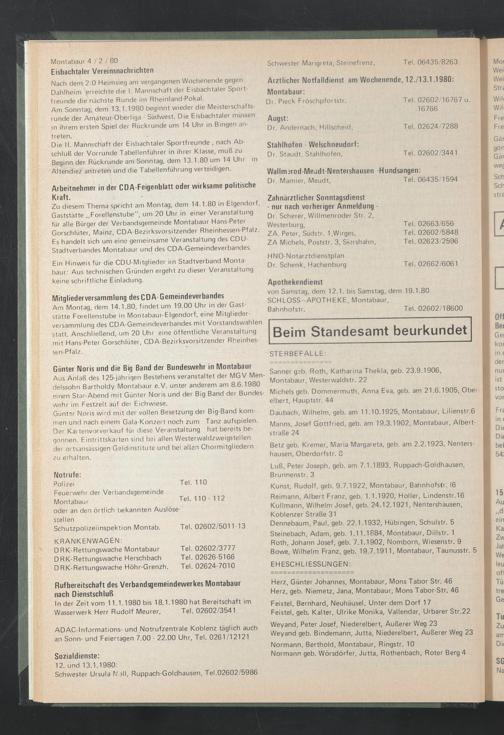 ln der Zeit vom 11.1.1980 bis 18.1.1980 hat Bereitschaft im Wasserwerk Herr Rudolf Meurer, Tel. 02602/3541