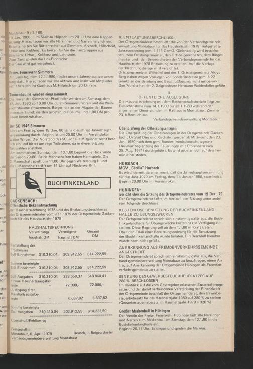 (der Haushaltsrechnung 1978 und des Entlastungsbeschlusses (des Ortsgemeinderates vom 9.11.1979 der Ortsgemeinde Gacken- |bach für das Haushaltsjahr 1978
