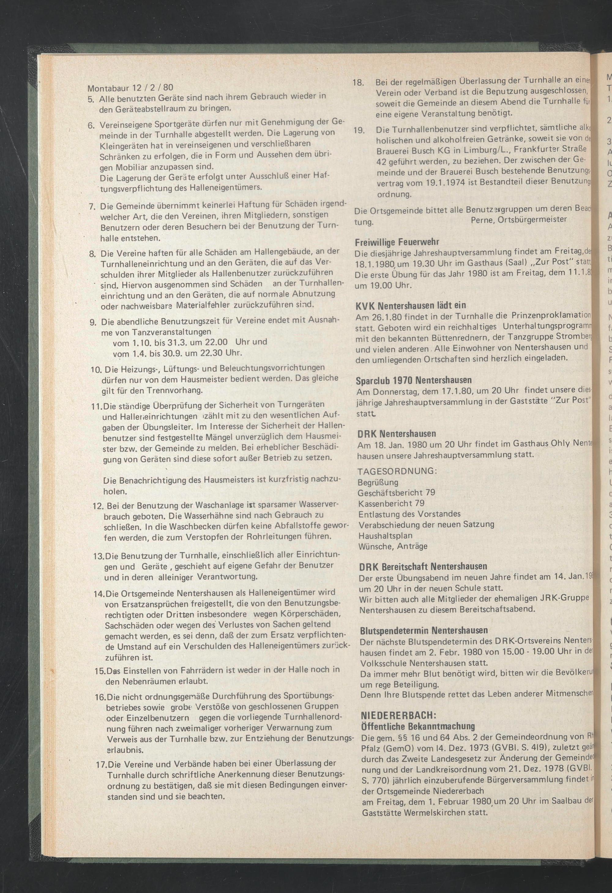 Am 26.1.80 findet in der Turnhalle die Prinzenproklamationl statt. Geboten wird ein reichhaltiges Unterhaltungsprogramm mit den bekannten Büttenrednern, der Tanzgruppe Stromber! und vielen anderen Alle Einwohner von Nentershausen und I den umliegenden Ortschaften sind herzlich eingeladen. I