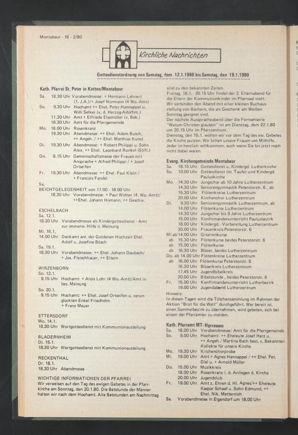 Gottesdienstordnung von Samstag, dem 12.1.1980 bis Samstag, den 19.1.1980