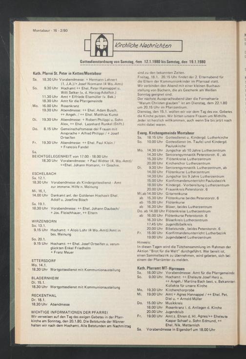 WICHTIGE INFORMATIONEN DER PFARREI Wir verweisen auf den Tag des ewigen Gebetes in der Pfarrkirche am Sonntag, den 20.1.80. Die Betstunde der Männer halten wir nach dem Hochamt. Alle Betstunden am Nachmittag