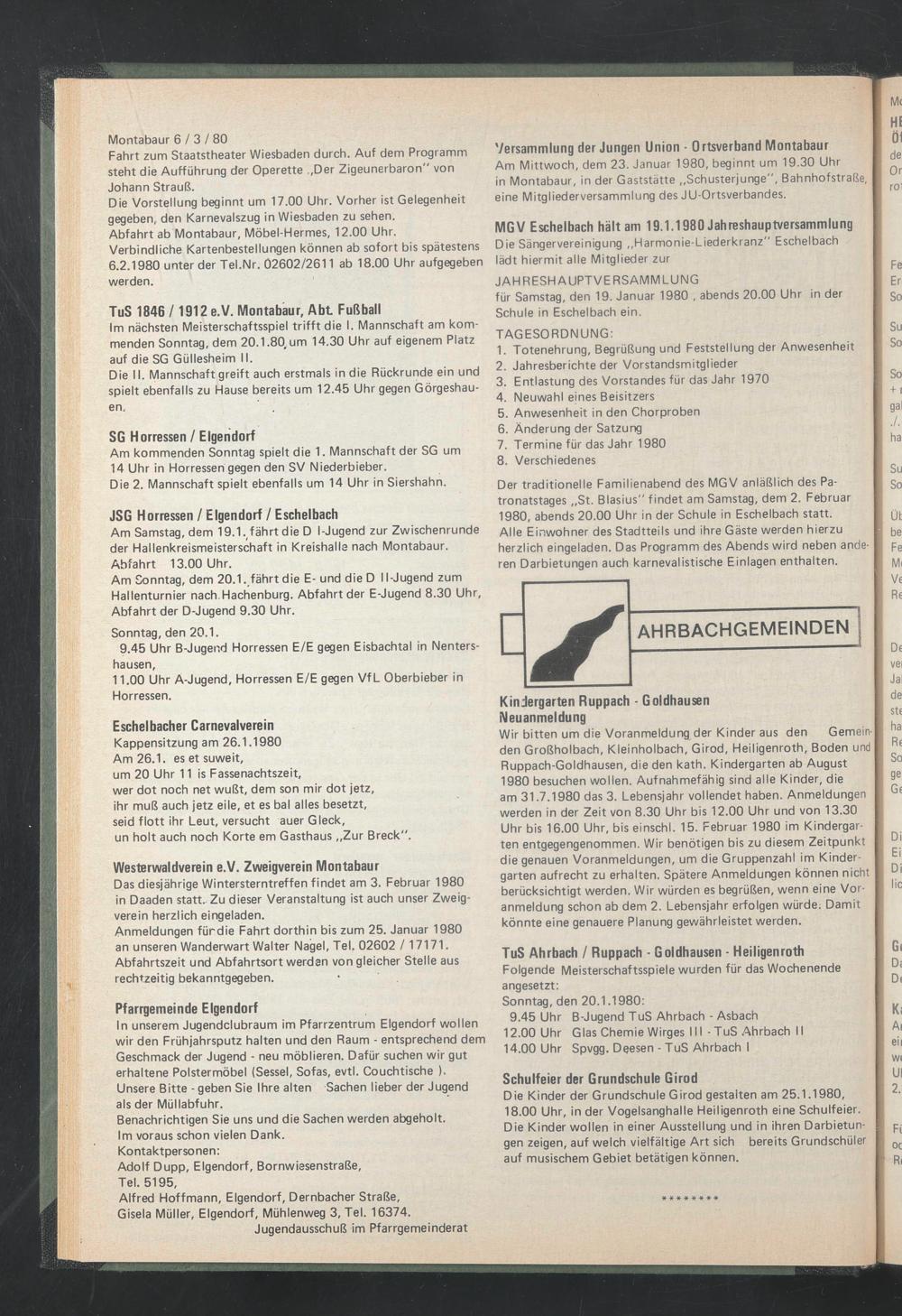 Anmeldungen für die Fahrt dorthin bis zum 25. Januar 1980 an unseren Wanderwart Walter Nagel, Tel. 02602 / 17171. Abfahrtszeit und Abfahrtsort werden von gleicher Stelle aus rechtzeitig bekanntgegeben.