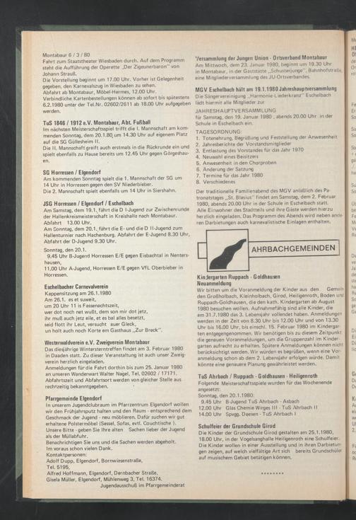 Der traditionelle Familienabend des MGV anläßlich des Patronatstages „St. Blasius" findet am Samstag, dem 2, Februar 1980, abends 20.00 Uhr in der Schule in Eschelbach statt.