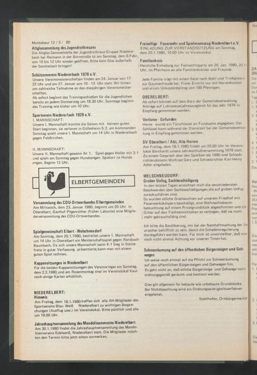 Am Mittwoch, dem 23. Januar 1980, beginnt um 20 Uhr in Oberelbert, Gasthof Pilgenröther (früher Labonte) eine Mitgliederversammlung des CDU-Ortsverbandes.