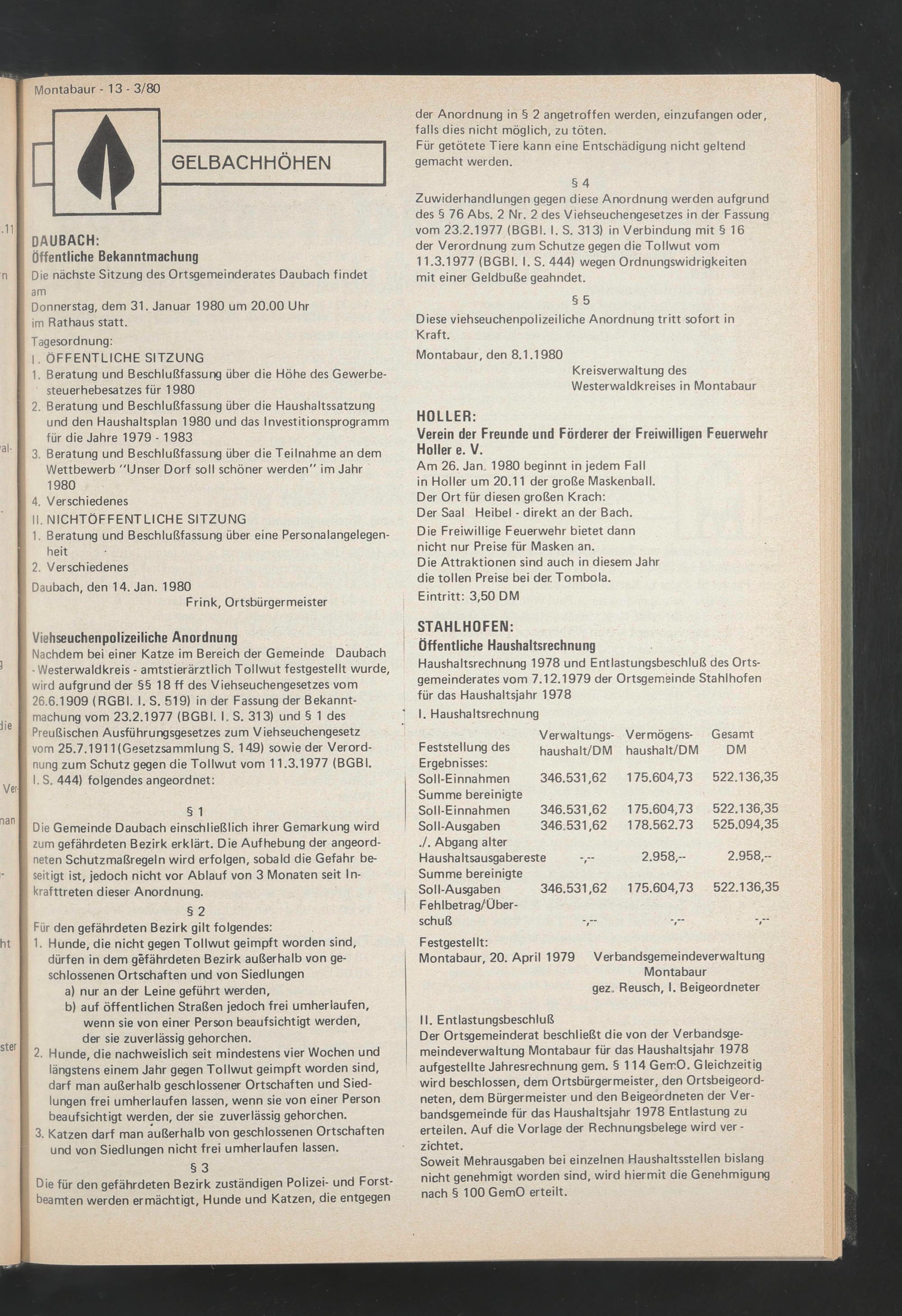 Der Ortsgemeinderat beschließt die von der Verbandsgemeindeverwaltung Montabaur für das Haushaltsjahr 1978 aufgestellte Jahresrechnung gern. § 114 GemO. Gleichzeitig wird beschlossen, dem Ortsbürgermeister, den Ortsbeigeordneten, dem Bürgermeister und den Beigeordneten der Verbandsgemeinde für das Haushaltsjahr 1978 Entlastung zu erteilen. Auf die Vorlage der Rechnungsbelege wird ver - zichtet.