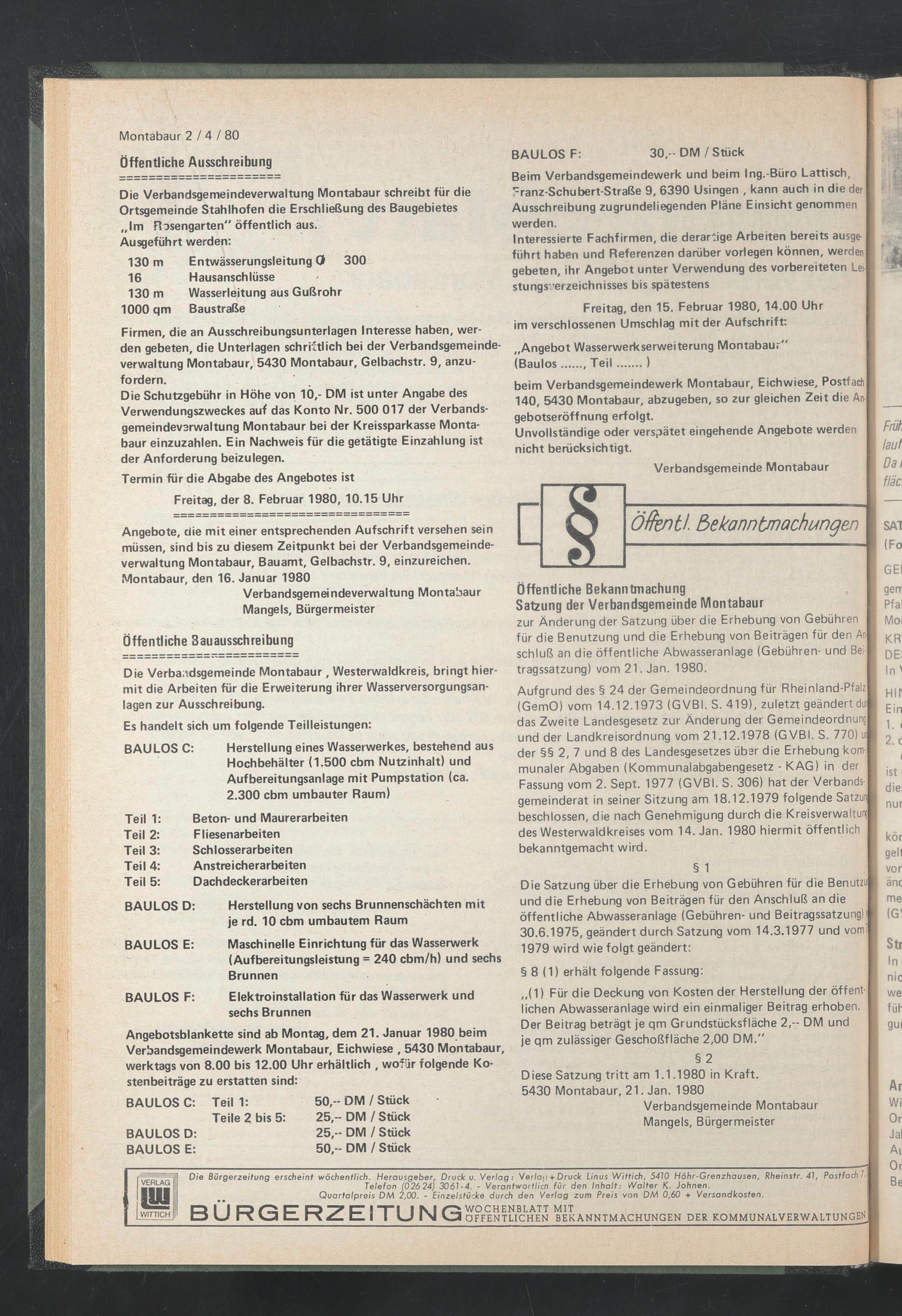 Angebotsblankette sind ab Montag, dem 21. Januar 1980 beim Verbandsgemeindewerk Montabaur, Eichwiese , 5430 Montabaur, werktags von 8.00 bis 12.00 Uhr erhältlich , wofür folgende Kostenbeiträge zu erstatten sind: