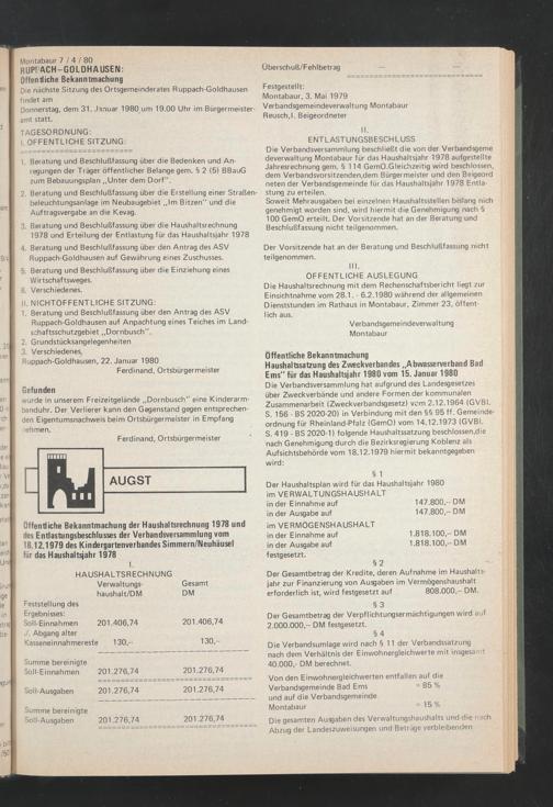 ÖFFENTLICHE AUSLEGUNG Die Haushaltsrechnung mit dem Rechenschaftsbericht liegt zur Einsichtnahme vom 28.1. - 6.2.1980 während der allgemeinen Dienststunden im Rathaus in Montabaur, Zimmer 23, öffentlich aus.