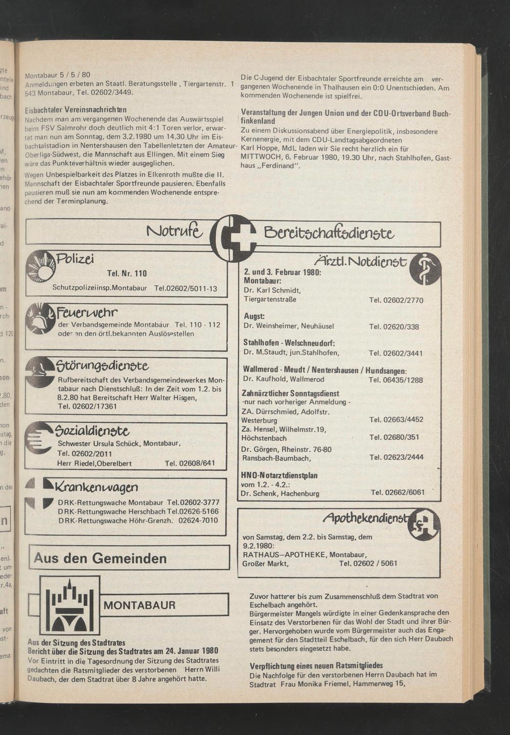 Rufbereitschaft des Verbandsgemeindewerkes Montabaur nach Dienstschluß: In der Zeit vom 1.2. bis 8.2.80 hat Bereitschaft Herr Walter Hisgen,