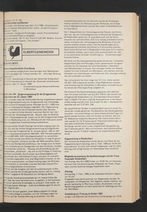 der nunmehr nach der Gemeindeordnung vorgesehenen gemeinmen Bürgerversammlung von Ortsgemeinde und Verbandsge- einde konnte Ortsbürgermeister Hübinger am 22.1.1980 eine eihe von interessierten Bürgern begrüßen. Die Tagesordnung h u.a. einen Bericht des Ortsbürgermeisters über aktuelle agen aus dem örtlichen Bereich und einen Bericht des I.Beiordneten der Verbandsgemeinde , Reusch, über die Maßnahen der Verbandsgemeinde, soweit sie für die Ortsgemeinde Nieder bertvon Bedeutung sind, vor. Mittelpunkt der Diskussion waren doch die geplanten Kanalisationsbaumaßnahmen.