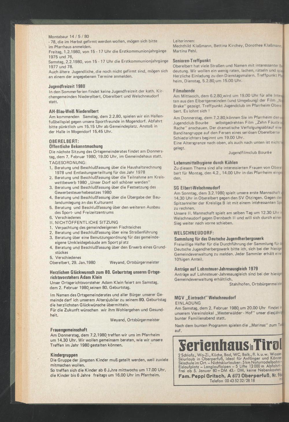 Unser Ortsgerichtsvorsteher Adam Klein feiert am Samstag, dem 2. Februar 1980,seinen 80. Geburtstag.