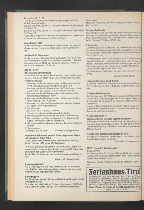 Die nächste Sitzung des Ortsgemeinderates findet am Donnerstag, dem 7. Februar 1980, 19.00 Uhr, im Gemeindehaus statt. TAGESORDNUNG: