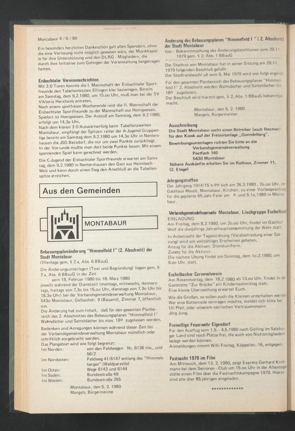 Montabaur, den 5. 2, 1980 Mangels, Bürgermeister