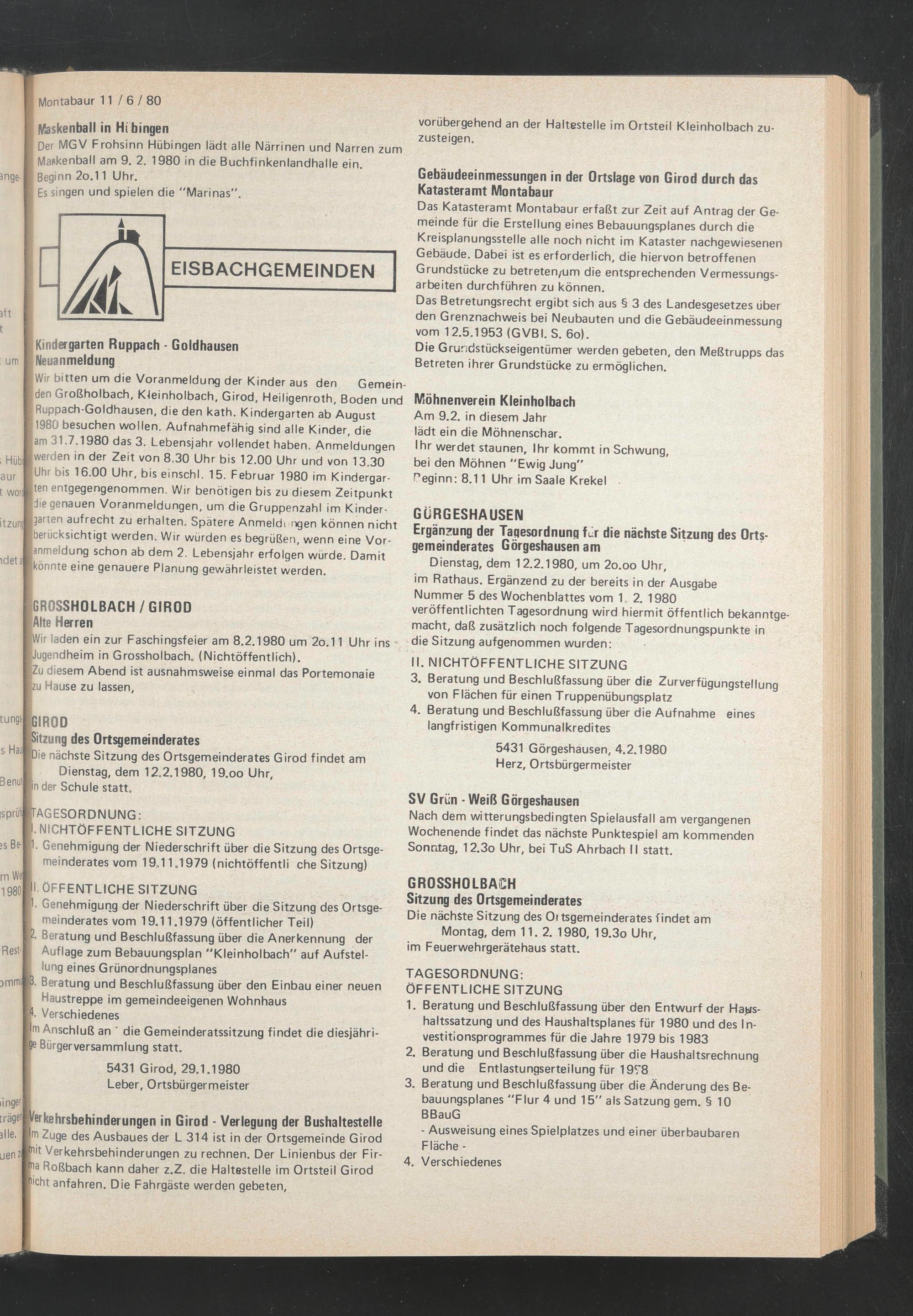 >ie nächste Sitzung des Ortsgemeinderates Girod f indet am Dienstag, dem 12.2.1980, 19.oo Uhr, in der Schule statt.