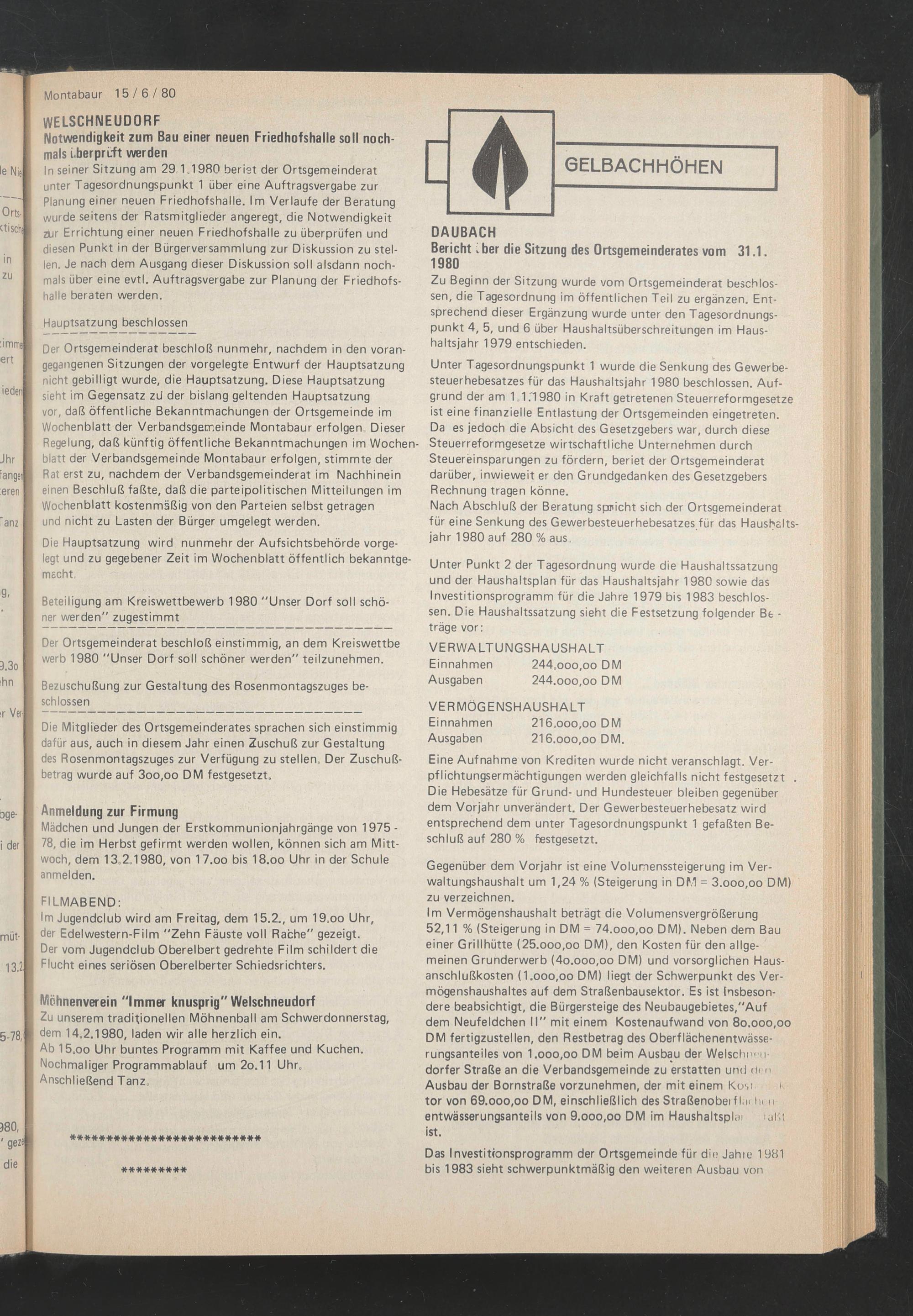 Unter Punkt 2 der Tagesordnung wurde die Haushaltssatzung und der Haushaltsplan für das Haushaltsjahr 1980 sowie das Investitionsprogramm für die Jahre 1979 bis 1983 beschlossen. Die Haushaltssatzung sieht die Festsetzung folgender Be - träge vor: