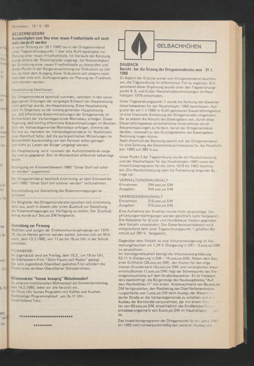 Der Ortsgemeinderat beschloß einstimmig, an dem Kreiswettbe werb 1980 "Unser Dorf soll schöner werden" teilzunehmen.