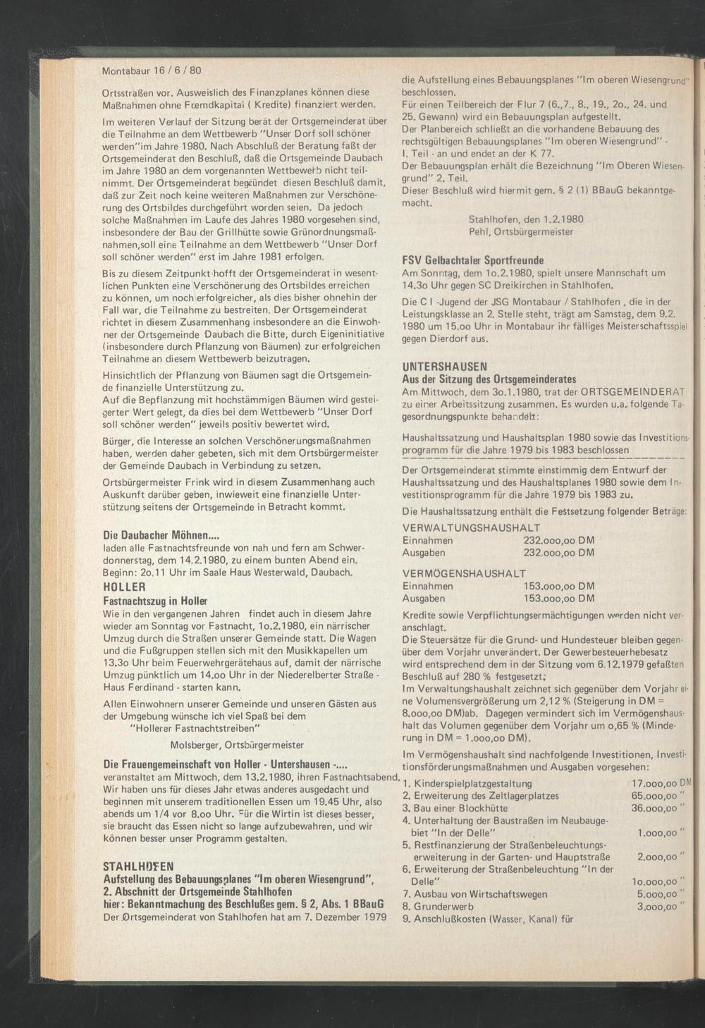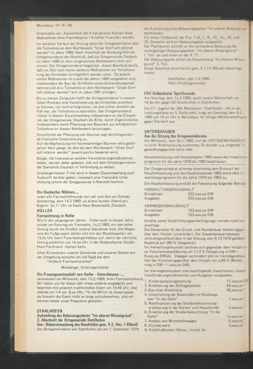 Am Mittwoch, dem 3o.1.1980, trat der ORTSGEMEINDERAT zu einer Arbeitssitzung zusammen. Es wurden u.a., folgende Tagesordnungspunkte behandelt: