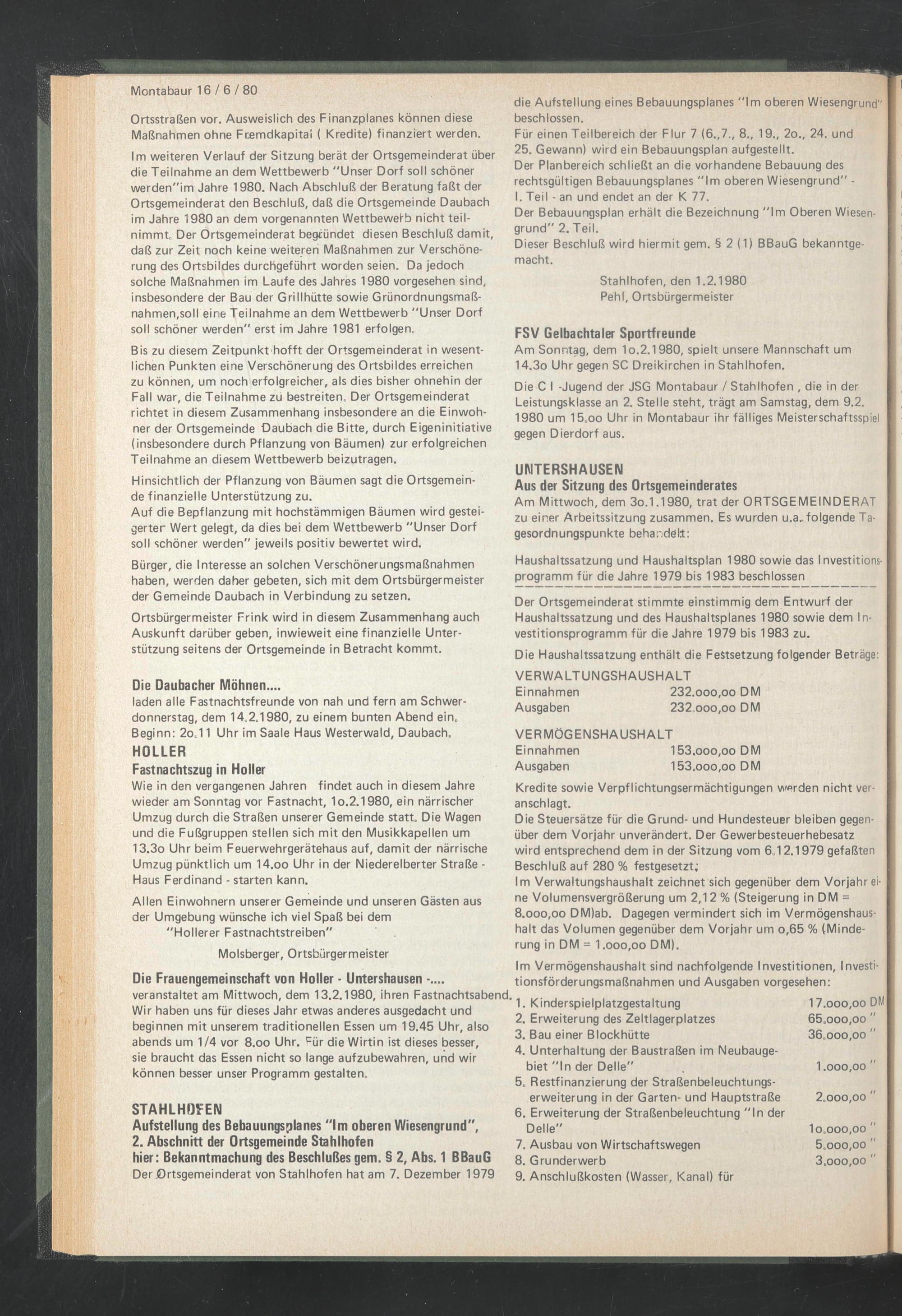 Der Ortsgemeinderat stimmte einstimmig dem Entwurf der Haushaltssatzung und des Haushaltsplanes 1980 sowie dem Investitionsprogramm für die Jahre 1979 bis 1983 zu.