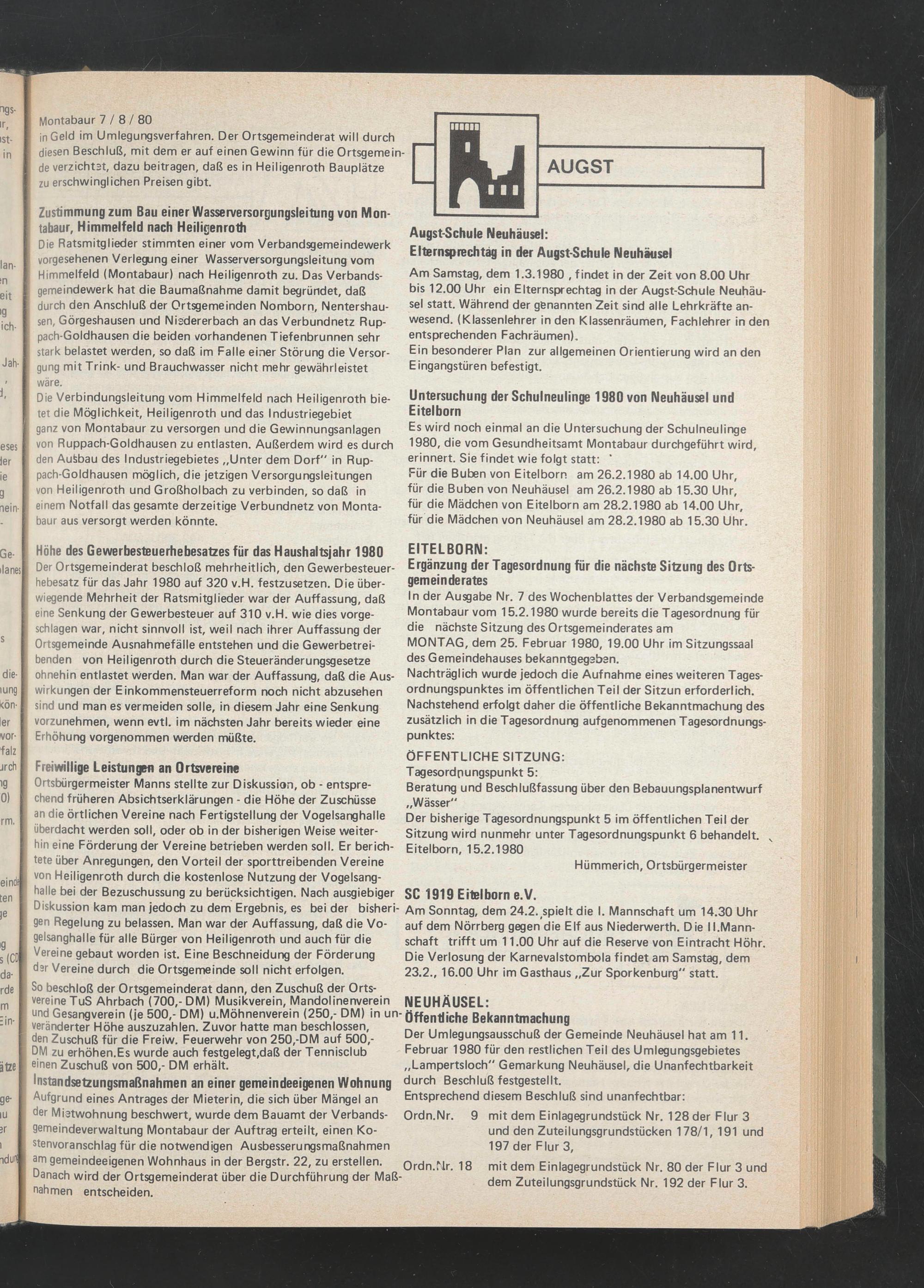 In der Ausgabe Nr. 7 des Wochenblattes der Verbandsgemeinde Montabaur vom 15.2.1980 wurde bereits die Tagesordnung für die nächste Sitzung des Ortsgemeinderates am MONTAG, dem 25. Februar 1980, 19.00 Uhr im Sitzungssaal des Gemeindehauses bekanntgegeben.
