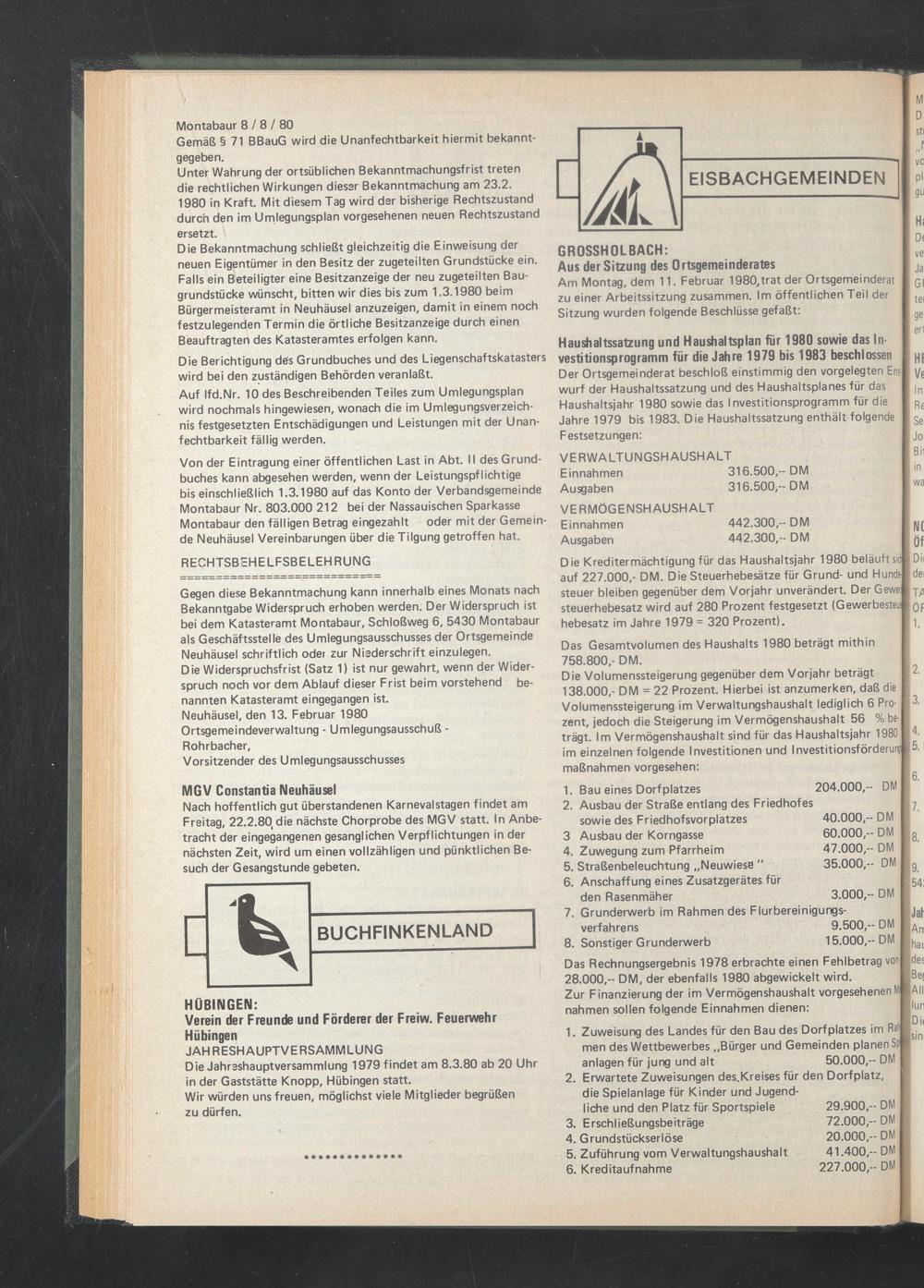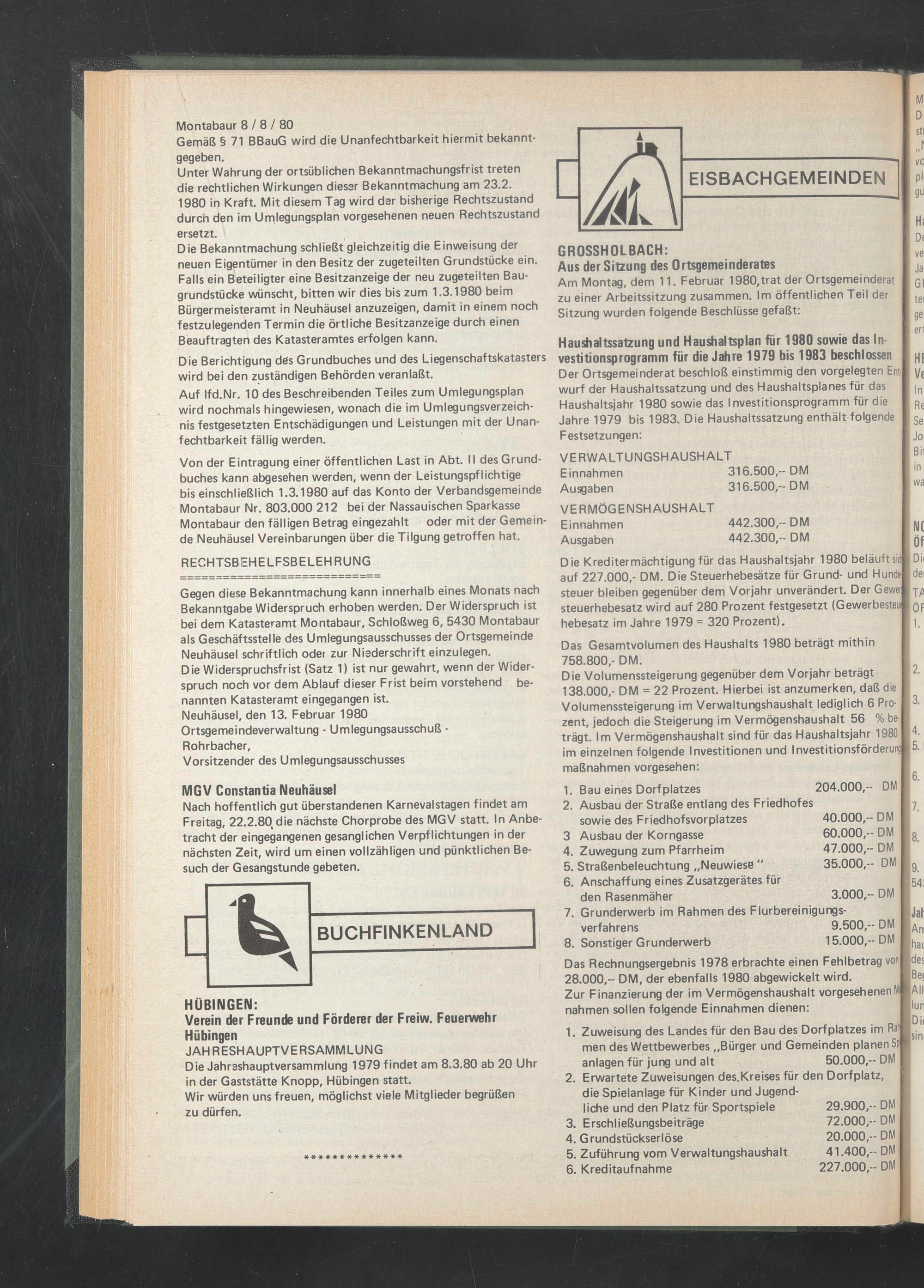 Der Ortsgemeinderat beschloß einstimmig den vorgelegten Ent| wurf der Haushaltssatzung und des Haushaltsplanes für das Haushaltsjahr 1980 sowie das Investitionsprogramm für die Jahre 1979 bis 1983. Die Haushaltssatzung enthält folgende Festsetzungen: