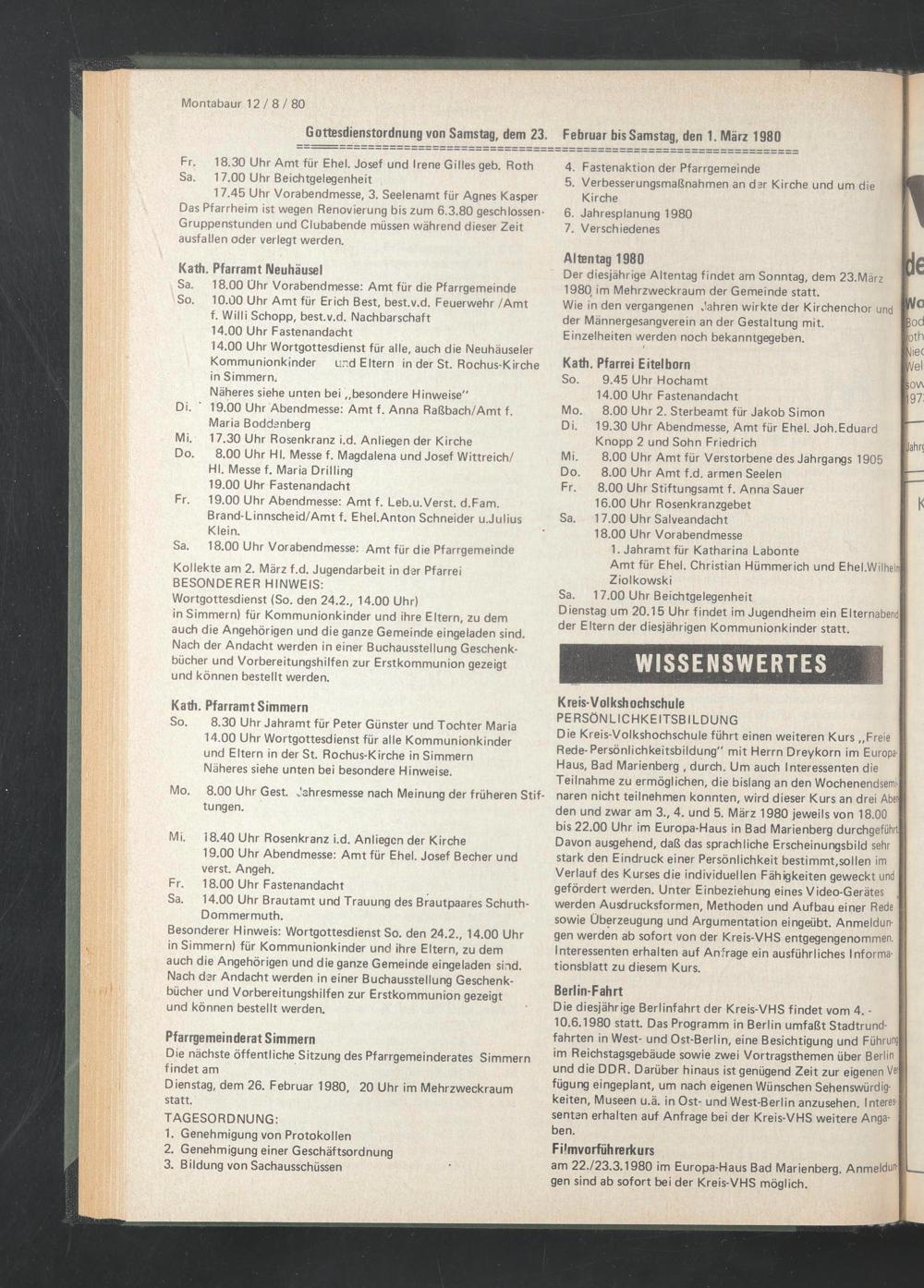 17.45 Uhr Vorabend messe, 3. Seelenamt für Agnes Kasper Das Pfarrheim ist wegen Renovierung bis zum 6.3.80 geschlossen- Gruppenstunden und Clubabende müssen während dieser Zeit ausfallen oder verlegt werden.