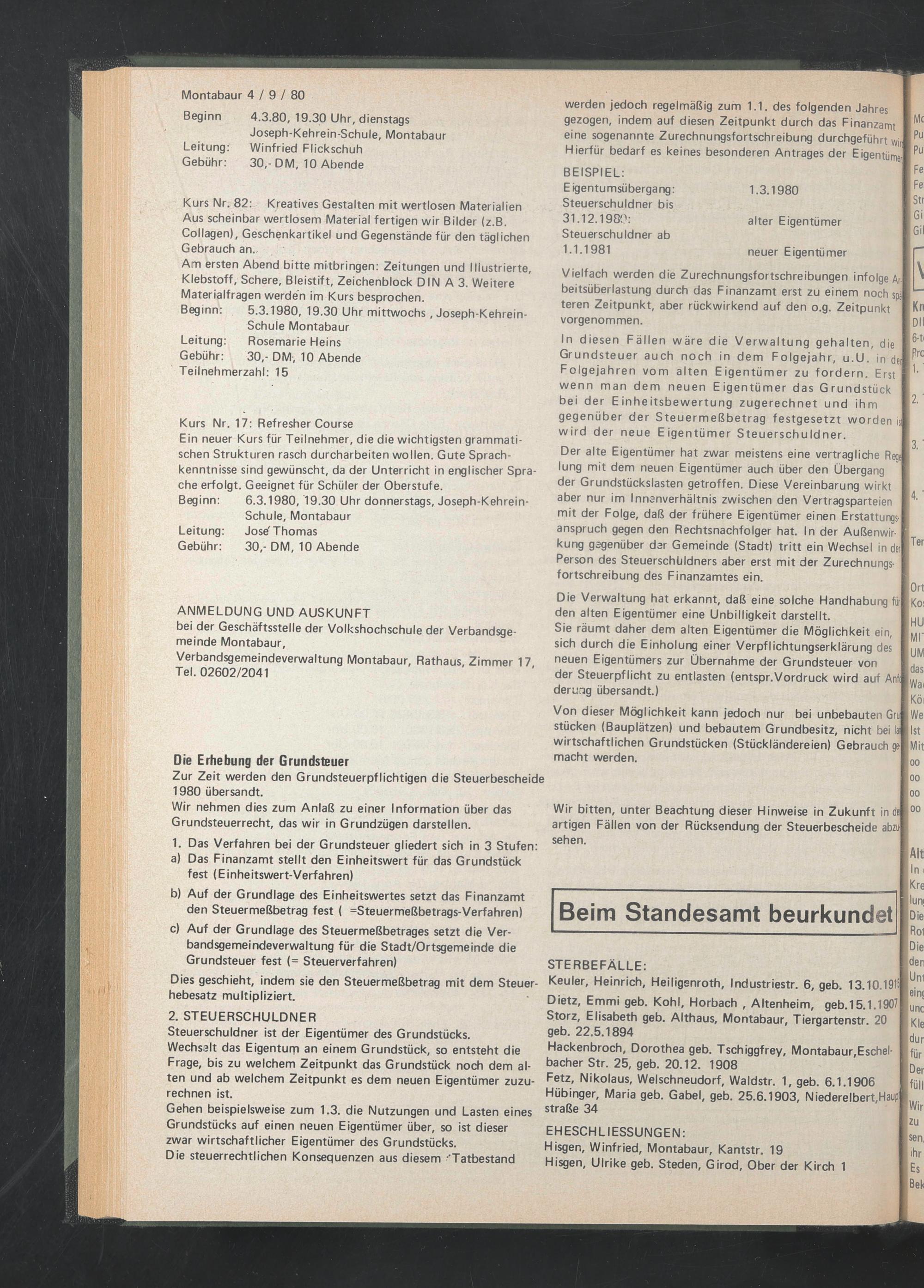 Beginn: 5.3.1980, 19.30 Uhr mittwochs .Joseph-Kehrein-