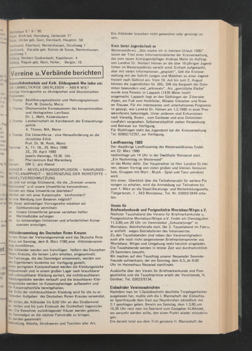 Westerwaldkreis. „Was mache ich in meinem Urlaub 1980" lautet der Titel eines Informationsblattes der Kreisverwaltung, das vom neuen Kreisjugendpfleger Andreas Malm im Auftrag von Landrat Dr. Norbert Heinen an die über 16-jährigen Jugend liehen im Westerwaldkreis verteilt wird. Einfach aufgemacht, aber mit vielen Informationen „gespickt", lädt die Kreisverwaltung mit der Schrift Jungen und Mädchen zu einer Jugendfreizeit nach Südtirol ein. Vom .19. Juli bis zum 2. August können die Jugendlichen für 395,- DM die Bergwelt der Dolomiten bewundern und „erkraxeln". Als „gemütliche Bleibe" wurde eine Pension in Lappach (1435 Meter hoch) ausgemacht. Lappach liegt an den Südhängen der Zillertaler Alpen, am Fuß vom Hochfeiler, Möseler Gletscher und Nave- ser Stausee. Für ein interessantes und unterhaltsames Programm ist gesorgt, wie Landrat Dr. Heinen am 1.2.1980 in einer Pressekonferenz bekanntgab. Unter anderem sind Exkursionen nach Venedig, Bozen , zum Gardasee und eine Dolomiten- rundfahrt vorgesehen. Seibstverstärjdlieh stehen Reiseleitung und Betreuer zur Verfügung.