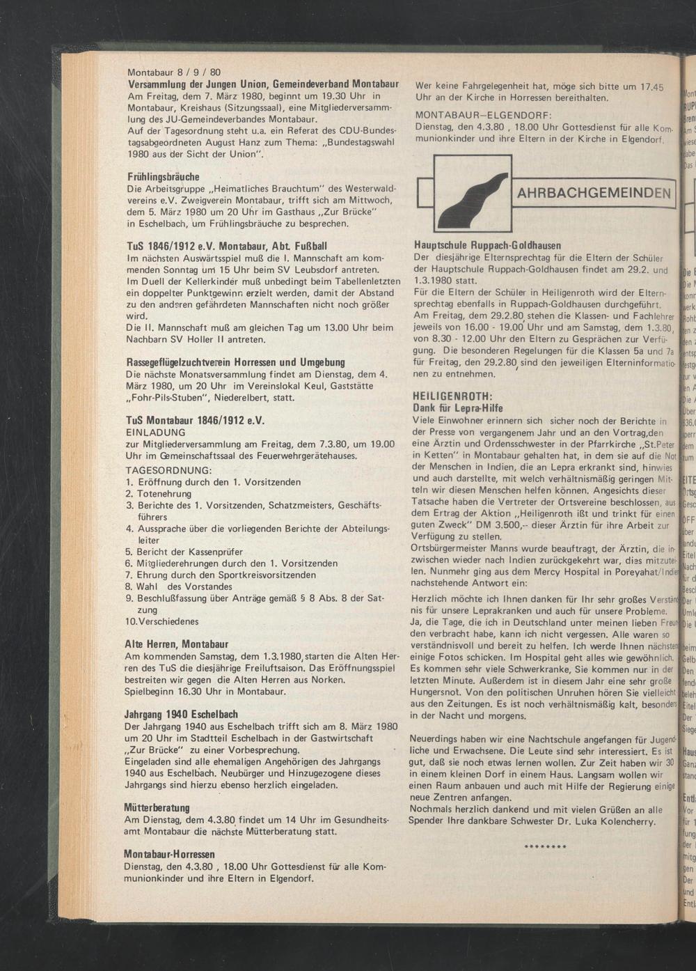 Am Freitag, dem 7. März 1980, beginnt um 19.30 Uhr in Montabaur, Kreishaus (Sitzungssaal), eine Mitgliederversammlung des JU-Gemeindeverbandes Montabaur.