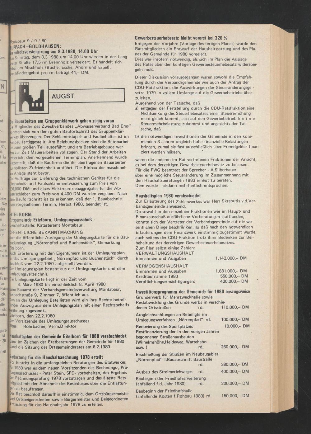 Entgegen der Vorjahre (Vorlage des fertigen Planes) wurde den Ratsmitgliedern ein Entwurf der Haushaltssatzung und des Planes der Gemeinde für 1980 vorgelegt.