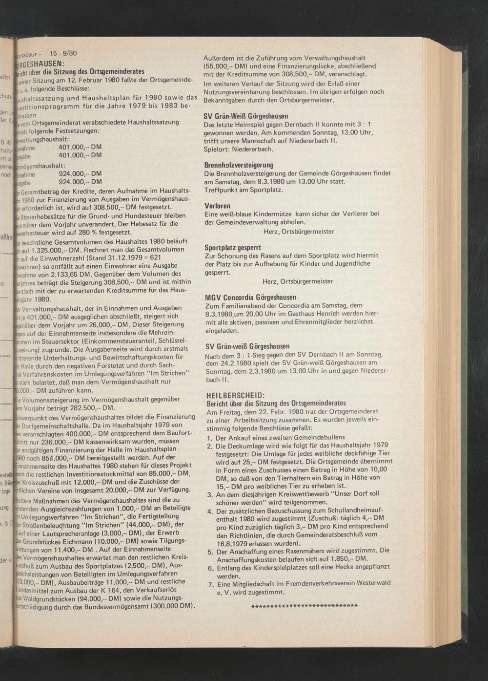 Am Freitag, dem 22. Febr. 1980 trat der Ortsgemeinderat zu einer Arbeitssitzung zusammen. Es wurden jeweils einstimmig folgende Beschlüsse gefaßt: