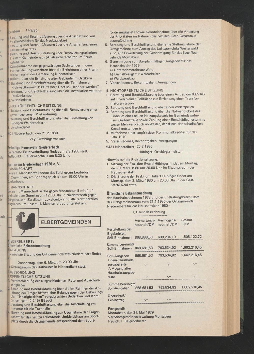der Haushaltsrechnung 1978 und des Entlastungsbeschlusses des Ortsgemeinderates vom 31.1.1980 der Ortsgemeinde Niederelbert für das Haushaltsjahr 1980