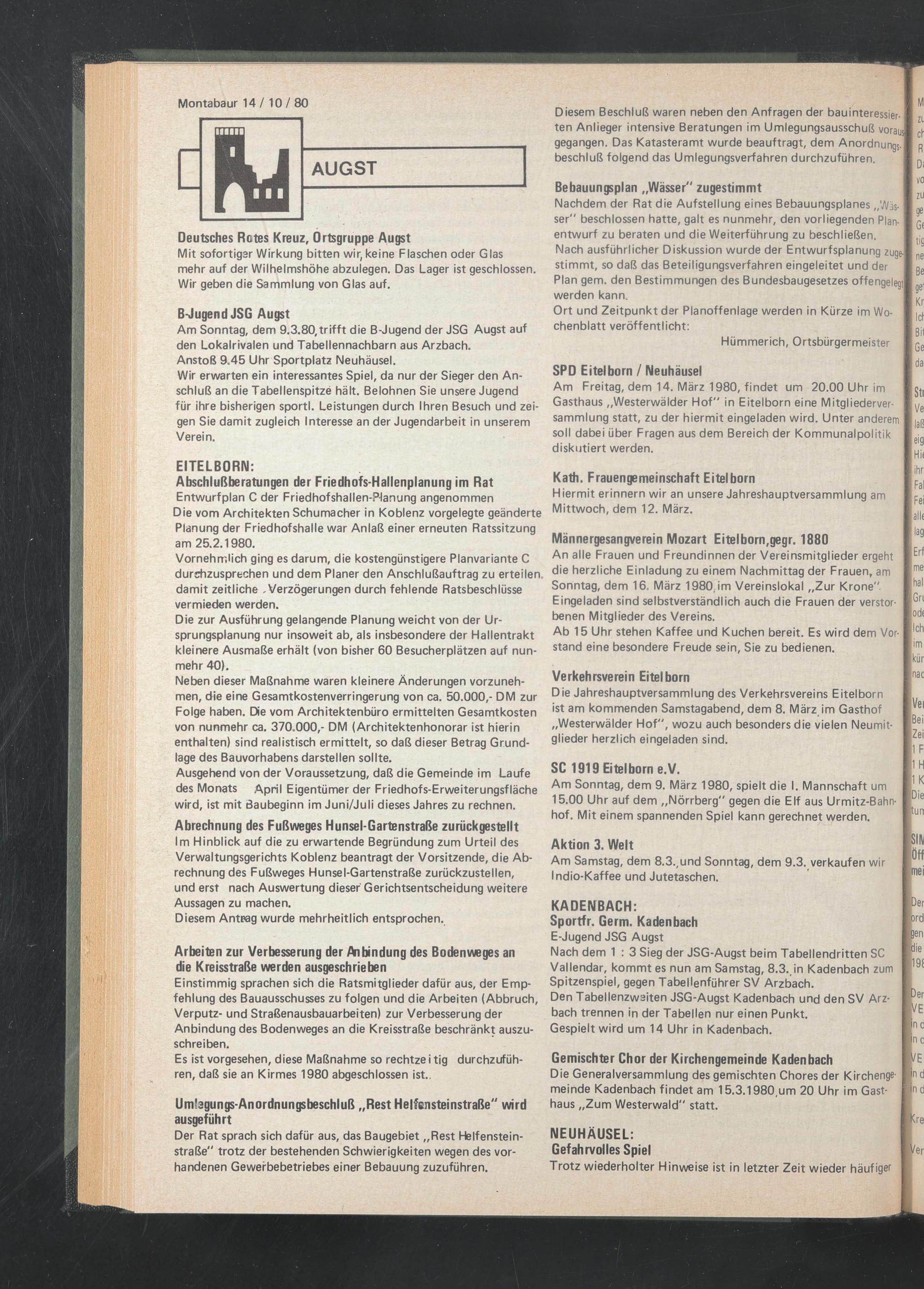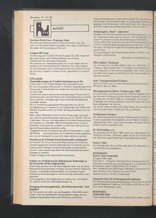 Am Freitag, dem 14. März 1980, findet um 20.00 Uhr im Gasthaus „Westerwälder Hof" in Eitelborn eine Mitgliederversammlung statt, zu der hiermit eingeladen wird. Unter anderem soll dabei über Fragen aus dem Bereich der Kommunalpolitik diskutiert werden.