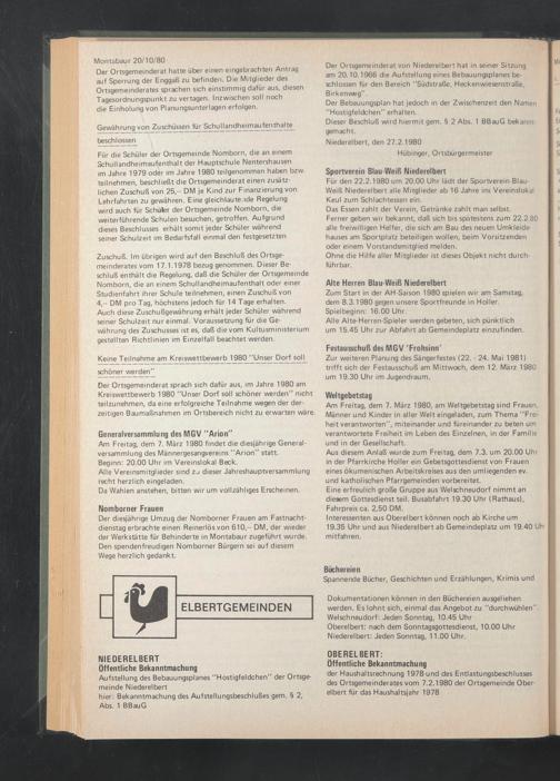 Der Ortsgemeinderat sprach sich dafür aus, im Jahre 1980 am Kreiswettbewerb 1980 "Unser Dorf soll schöner werden" nicht teilzunehmen, da eine erfolgreiche Teilnahme wegen der derzeitigen Baumaßnahmen im Ortsbereich nicht zu erwarten wäre.