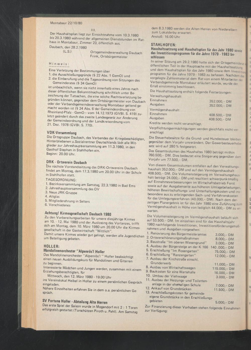 Das Gesamtvolumen des Haushaltes 1980 beträgt mithin 760.500,- DM. Dies bedeutet eine Steigerung gegenüber dem Vorjahr um 77.500,- DM.