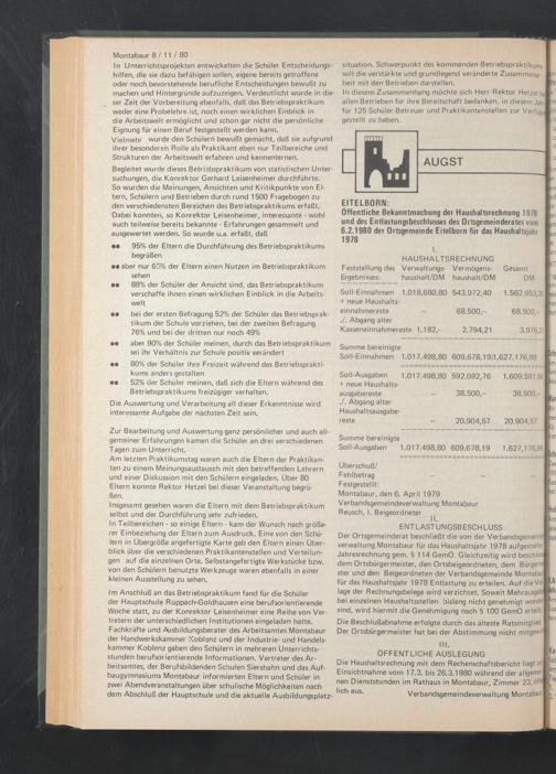 ÖFFENTLICHE AUSLEGUNG Die Haushaltsrechnung mit dem Rechenschaftsbericht liegt zur Einsichtnahme vom 17.3. bis 26.3.1980 während der allgemeinen Dienststunden im Rathaus in Montabaur, Zimmer 23, off® lieh aus. Verbandsgemeindeverwaltung Montabaur
