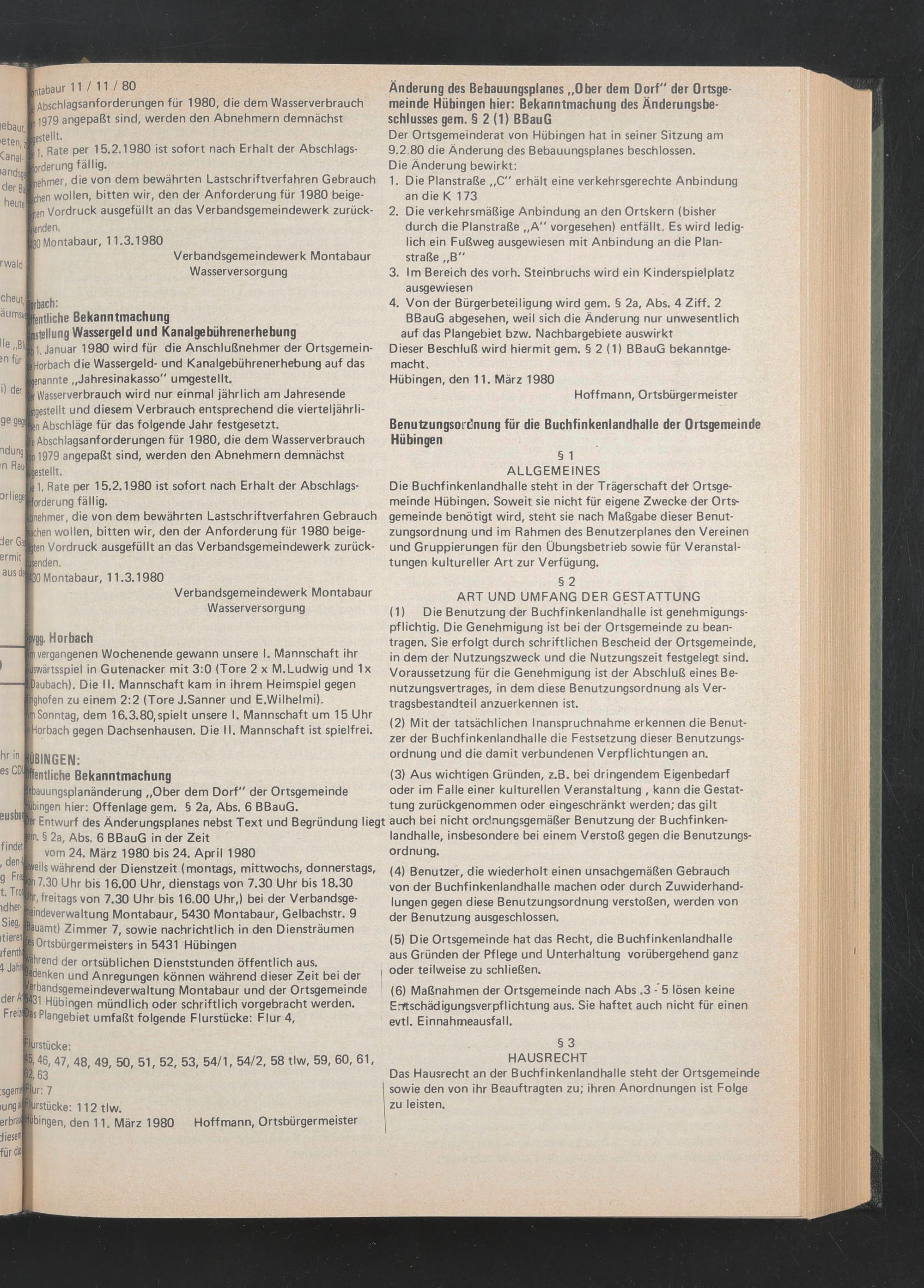 Der Ortsgemeinderat von Hübingen hat in seiner Sitzung am 9.2.80 die Änderung des Bebauungsplanes beschlossen.
