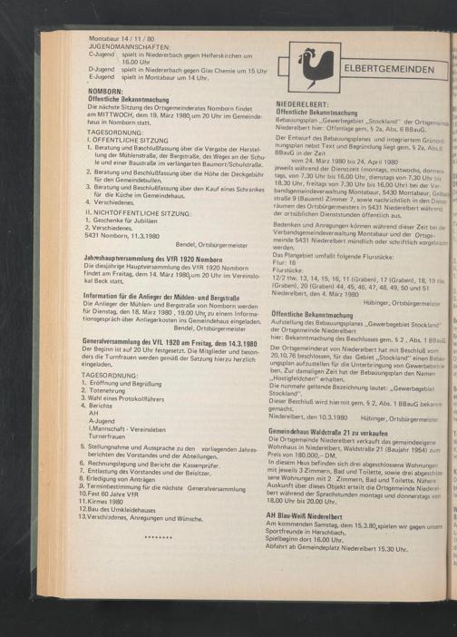 Die nächste Sitzung des Ortsgemeinderates Nomborn findet am MITTWOCH, dem 19. März 1980 ( um 20 Uhr im Gemeindehaus in Nomborn statt.
