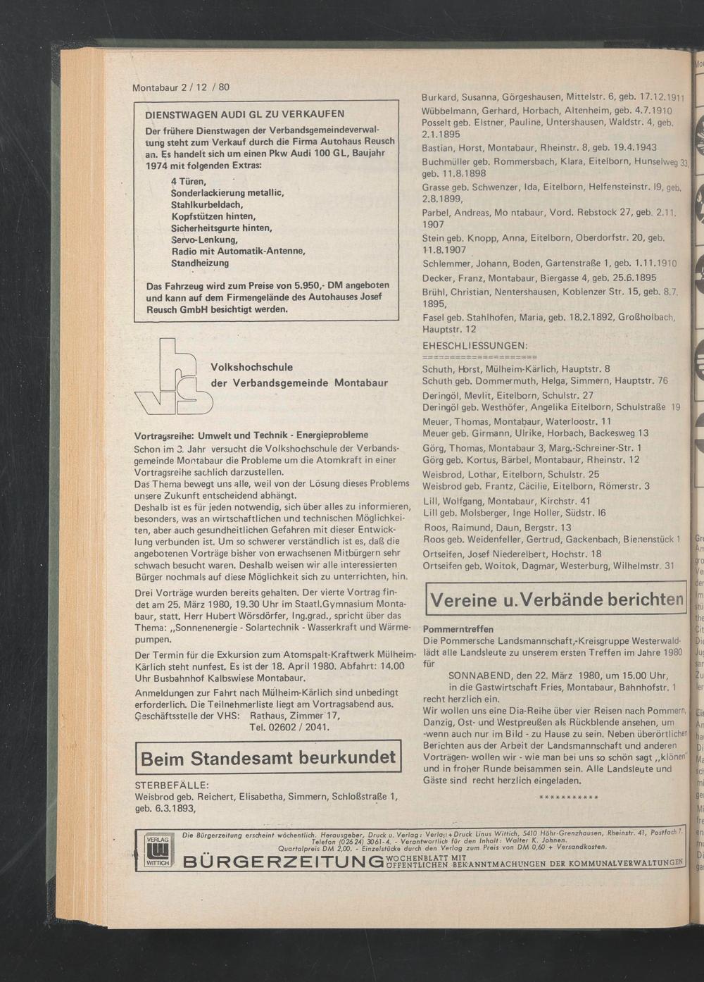 Drei Vorträge wurden bereits gehalten. Der vierte Vortrag findet am 25. März 1980, 19.30 Uhr im Staatl.Gymnasium Montabaur, statt. Herr Hubert Wörsdorf er, Ing.grad., spricht über das Thema: „Sonnenenergie - Solartechnik - Wasserkraft und Wärmepumpen.