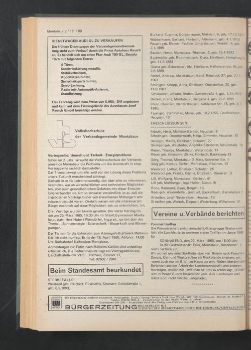 Der frühere Dienstwagen der Verbandsgemeindeverwal- tung steht zum Verkauf durch die Firma Autohaus Reusch an. Es handelt sich um einen Pkw Audi 100 GL, Baujahr 1974 mit folgenden Extras: