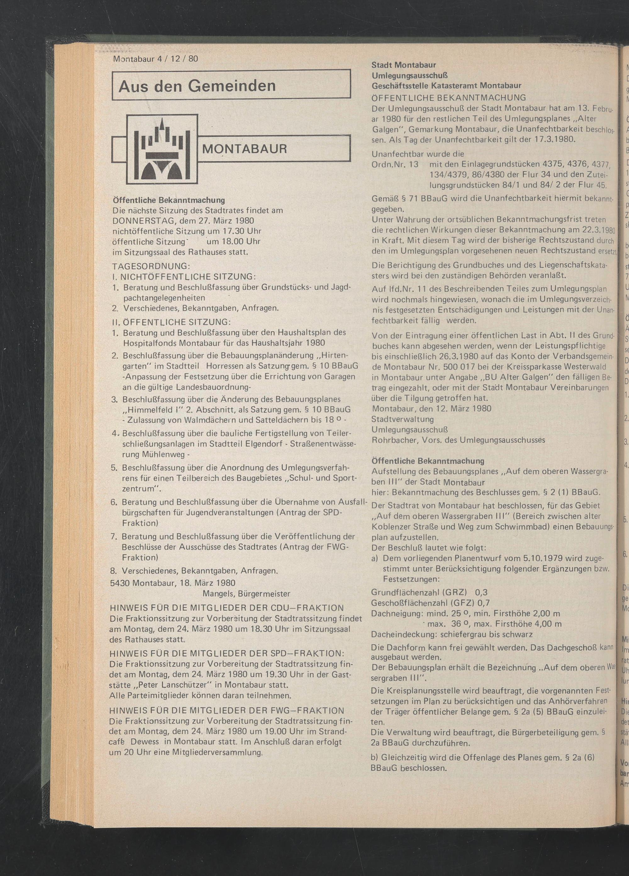Die Fraktionssitzung zur Vorbereitung der Stadtratssitzung findet am Montag, dem 24. März 1980 um 19.30 Uhr in der Gaststätte „Peter Lanschützer" in Montabaur statt.