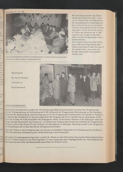 Besprochen und diskutiert wurden hier die verwaltungsmäßige Zusammenarbeit zwischen den Ortsgemeinden und der Kreisverwaltung, die Anbindung der B 49 im Bereich der Ortsgemeinde Nentershausen an die Autobahn, Probleme der Gasversorgung, die Schulorganisation für die Ortsgemeinden Heilberscheid und Nomborn, Probleme im Bereich des Tonabbaues im Gemarkungsbereich der Ortsgemeinde Girod, Gewährung von Zuschüssen im Bereich der Forsten für Eisbruchschäden des vergangenen Jahres. Einen breiten Rahmen in der Diskussion nahm die Frage nach der Bereitschaft des Kreises ein, im Rahmen des Ausbaues des Ortskernes innerhalb der Ortsgemeinde Nomborn sich an den Kosten für den Aufkauf von Bauobjekten zu beteiligen. Besichtigt wurde in der Ortsgemeinde Görgeshausen die im Bau befindliche Dorfgemeinschaftshalle.
