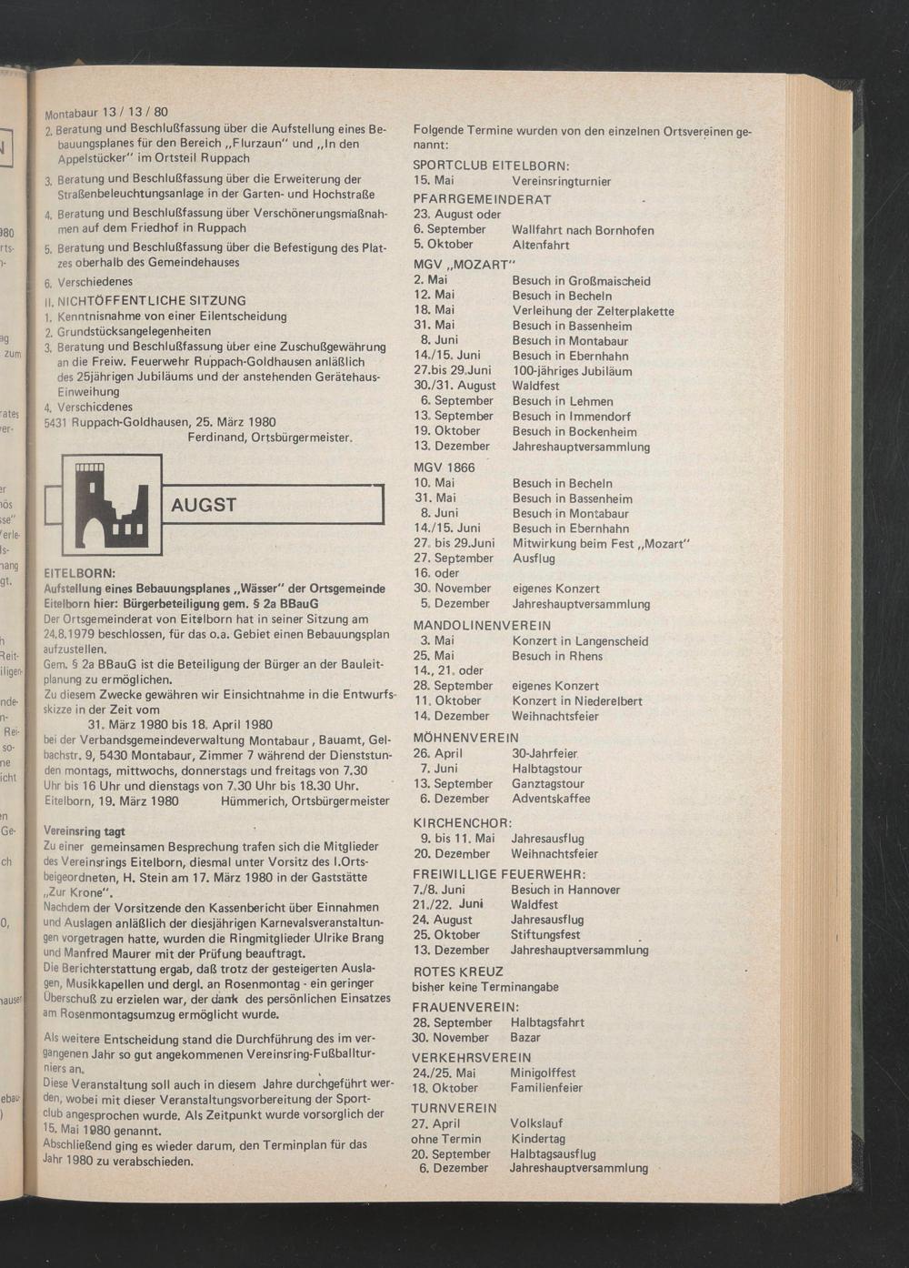 Zu einer gemeinsamen Besprechung trafen sich die Mitglieder des Vereinsrings Eitelborn, diesmal unter Vorsitz des I.Orts- beigeordneten, H. Stein am 17. März 1980 in der Gaststätte „Zur Krone".